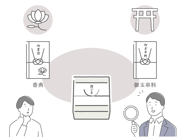 香典返しの「香典」とは、仏前に供える、お香を意味します。神道の場合、仏式の「香典」にあたるのが、「御玉串料」です。「御榊料」や「御霊前」とも言います。そのため、厳密には香典返しというのではなく、御玉串料などの返礼品というのが正しいでしょう。